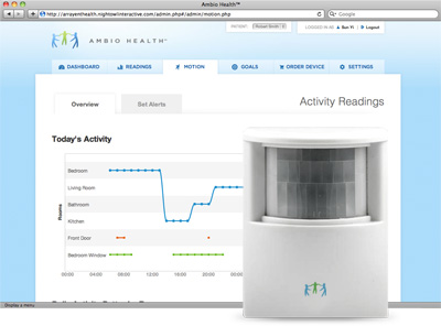 Ambio Health’s motion sensors allow you to monitor activity anywhere in the house and view charted activity history. Motion sensors use passive infrared technology (not cameras) and can be placed in the family room, kitchen, bedroom and even bathroom.