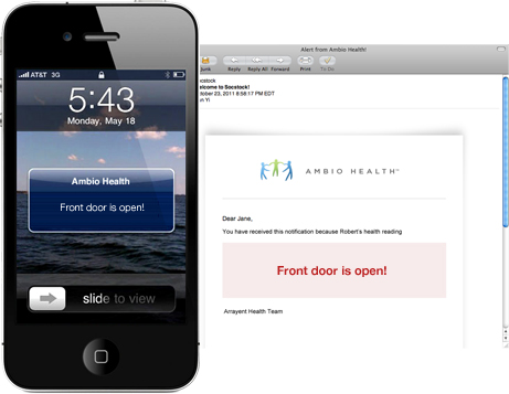Alarm conditions can be pre-determined to alert you if there is no activity when you expect it, or if there is motion when you don’t expect it. Just as with the health meters, activity thresholds can be customized and alarms triggered as specified.